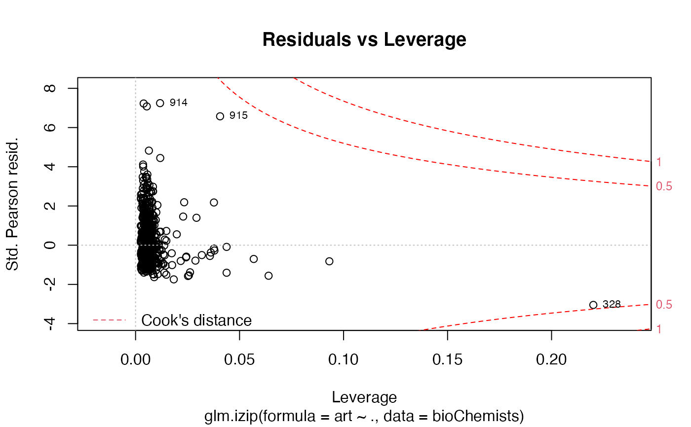 data(bioChemists) M_bioChem <- glm.izip(art ~ ., data = bioChemists) ## The default plots are shown plot(M_bioChem) # or autoplot(M_bioChem)# or autoplot(M_bioChem, which = c(2,3))